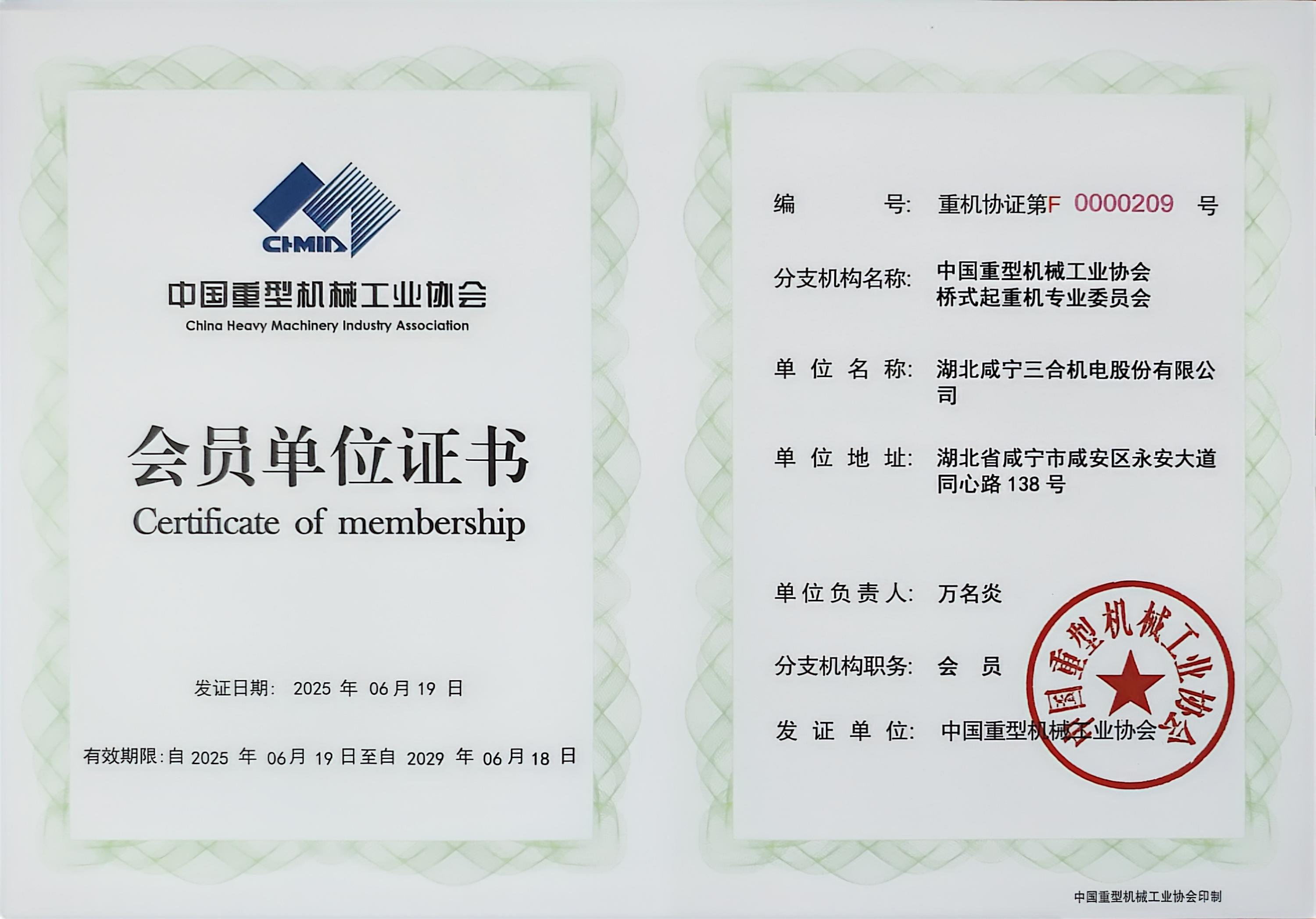 中國(guó)重型機(jī)械工業(yè)協(xié)會(huì)橋式起重機(jī)專業(yè)委員會(huì)會(huì)員單位證書